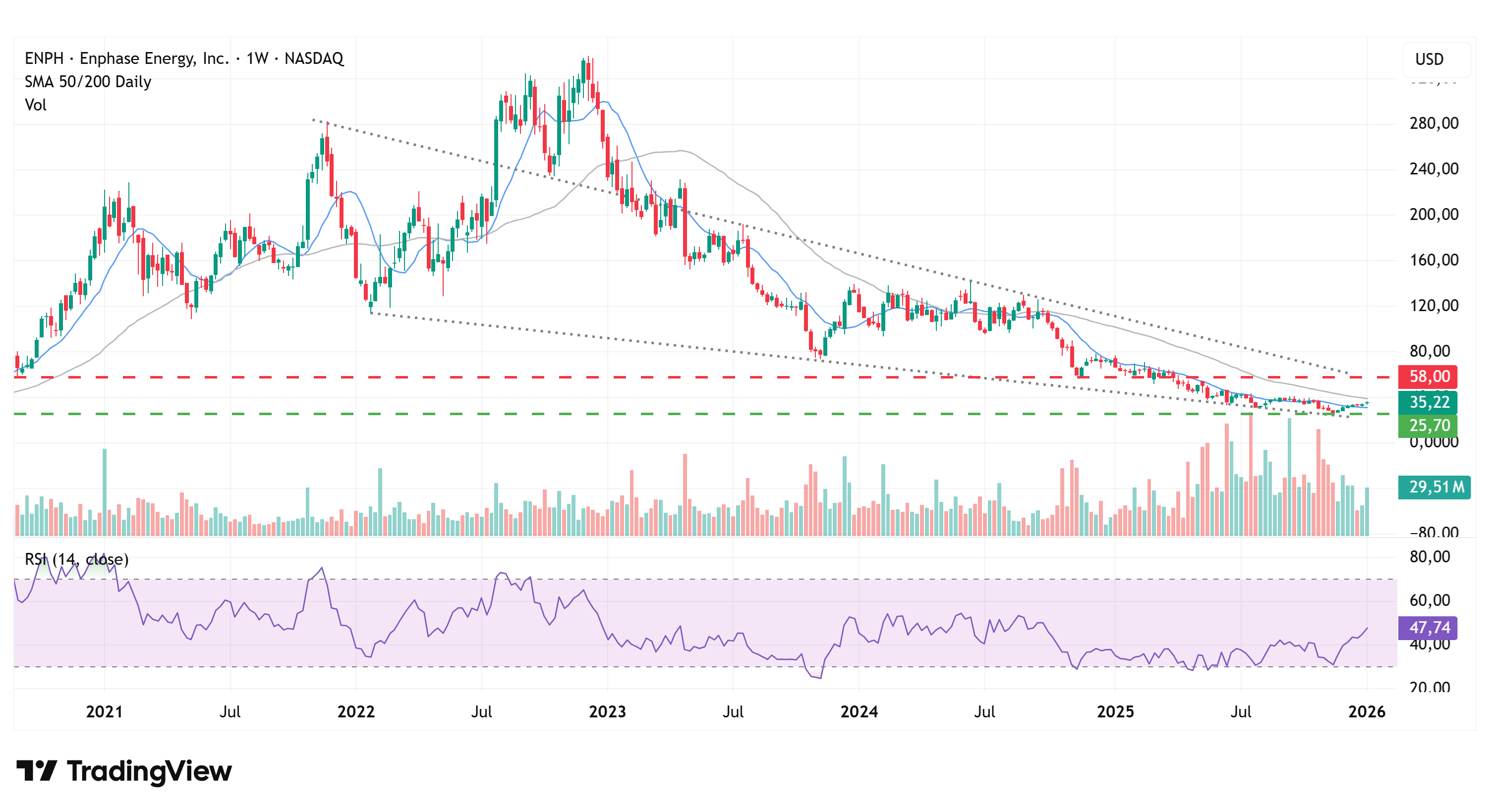 Die Notierung von Enphase befindet sich momentan in einem seit Ende 2022 andauernden keilförmig verlaufenden Abwärtstrend. Innerhalb von diesem wurde zuletzt die Marke von 25 USD erfolgreich getestet. Aktuell befindet sich die Notierung wieder knapp oberhalb der 50-Tage-Linie (31 USD) und setzt zu einem Test der 200-Tage-Linie an, die derzeit bei knapp 39 USD notiert. Sollte die Notierung an der 200-Tage-Linie scheitern ist ein erneuter Test des 2025er Tiefs bei 25,70 USD nicht auszuschließen. Darunter liegt die nächste Unterstützung im Bereich von 20 USD.